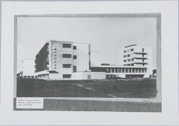 Curator: Klaus Hertig captured this striking view of the Bauhaus Building in Dessau, between 1925 and 1926. Editor: It feels so…stark. Almost unsettlingly geometric. Curator: Indeed. Notice the interplay of cubic forms, the flat roofs, and the glass curtain walls, all devoid of ornamentation. It’s a manifesto in concrete and steel. Editor: It is! The vertical lettering reading "Bauhaus" feels like a bold statement of purpose, a signpost to a new era. Curator: Exactly. The building itself embodies the Bauhaus principles of functionalism and the synthesis of art, craft, and technology. Editor: The photo's tonality, the contrast...it adds to the sense of a brave, new world being forged. Curator: It’s a testament to the power of architectural photography to capture not just a building, but an ethos. Editor: Makes you think about how spaces can literally shape our minds, doesn’t it?