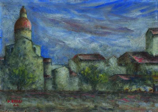 Curator: Look, aren't the textures something else in this landscape? What's your gut reaction? Editor: It feels wonderfully unresolved. All those little dabs of paint shimmering—like sunlight on… well, everything! It's more about capturing a feeling than depicting reality, right? Curator: Precisely. This painting is known as "Farm in Normandy," and while the date of its creation isn't definitively known, it is attributed to Gustave Loiseau. Note the thick application of oil paint, characteristic of Impressionist plein-air painting. The visual field is articulated through small touches and juxtaposed hues. Editor: Normandy, huh? You can almost smell the damp earth. It's funny, the subject matter feels quite grounded and solid. Like a solid wall protecting a small community… but Loiseau breaks that all apart in color and technique, a gorgeous tension in the visible and the invisible. I am also taken by the large tree framing the landscape on the left side; I’d describe this painting as balanced chaos. Curator: An insightful observation. See how Loiseau renders the architectural forms—the house, the church steeple in the distance—with the same vibrant, fragmented brushwork he uses for the foliage? Editor: Right! So everything is equally important, no hierarchy... Even that dull gray wall is full of colour and light. It's democratizing! Curator: Indeed. It speaks to Impressionism's radical departure from academic tradition—an attempt to capture the transient qualities of light and atmosphere over the literal representation of form. The artist employs distinct brush strokes; observe the individual touches coalesce to form a unified optical experience for the viewer. It's a compelling interplay between parts and the whole. Editor: I like how it pulls you in… from the macro to the micro and back again. It also feels deeply calming despite all that energy. It doesn’t tell you what to think about this specific “Farm in Normandy”--the longer you gaze the more possibilities for what the painting IS and what it COULD be emerge. Curator: Well, thinking through the interplay of visual dynamics, its structure, color values… this painting offers an eloquent argument for the value of the ephemeral and perceptual. Editor: You know, after our little foray I now appreciate the calm—the painting provides a safe space to consider and be, despite the chaotic composition. It is good for the soul.