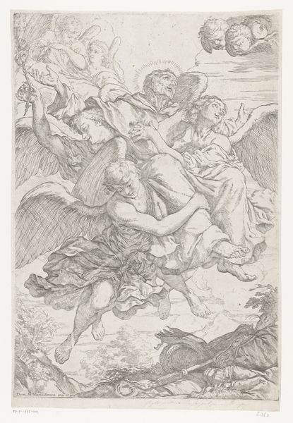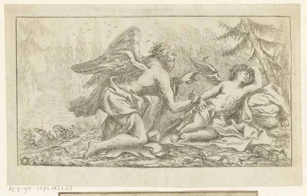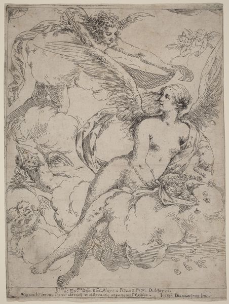 Curator: At first glance, this feels… dreamlike. The figures almost seem to float on the page. Editor: Indeed. We are observing “Venus and Cupid,” a drawing rendered in ink on paper dating back to the period 1590-1600. The artist, Anton Eisenhoit, masterfully employs engraving techniques to bring forth this Renaissance vision. Curator: The composition is quite intriguing. Venus is prominently placed, attended by Cupid, naturally. And then there's that Pegasus rearing up behind them... The linework creates an ethereal quality, doesn't it? Notice how the light catches the figures and highlights them within the piece, enhancing their shapes? Editor: Placing this work within its historical context, engravings like this played a crucial role in disseminating classical mythology during the Renaissance. The revival of interest in Greco-Roman culture directly informed patronage. Disseminating mythological and historical narratives were, as a matter of politics, essential! How else could people claim and perform power without recourse to precedent? Curator: Absolutely! But observe how Eisenhoit utilizes delicate lines to contour the bodies, imbuing the scene with a sensuous, albeit chaste, tone. Editor: A certain standardization of idealized beauty certainly occurs during that period. But consider too how access to these images was restricted. Ownership and display cemented your place within that economy of looking. Curator: Certainly, you're not wrong to identify a hegemonic gaze. But even from the distance of centuries, this print is undeniably striking. The contrasts, light and dark, direct the viewer’s eye and elicit an immediate and sustained impact on perception. Editor: An impact informed by layers of historical meaning. What is clear from analyzing this work, both formally and historically, is that visual culture preserves power dynamics across vast reaches of time. Curator: Ultimately, isn't that the enduring power of great art: that its ability to reveal deeper, less obvious truths resides in visual language. Editor: Well said! Whether focusing on aesthetics or historical contexts, hopefully visitors appreciate that both approaches deepen our experience of the art and the culture surrounding its production.