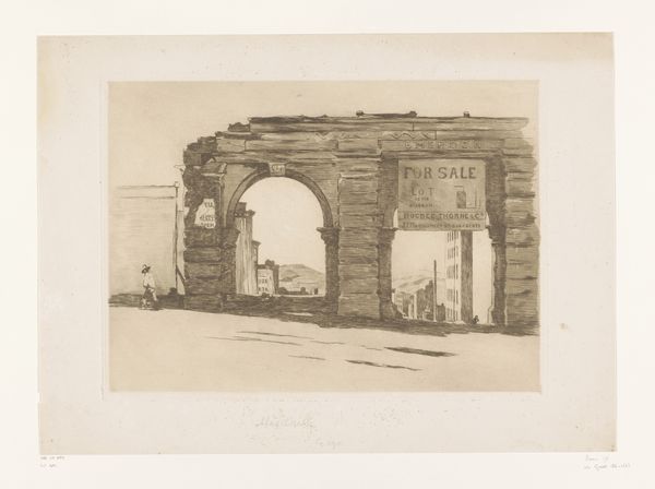 Julien Michel Gué created this print, titled 'Zicht op het Forum te Pompeï', sometime in the early 19th century. The print captures the ruins of Pompeii's forum, framing the ancient site through the lens of 19th-century European Romanticism. During this period, there was a growing fascination with classical antiquity, particularly with ruins which evoked feelings of melancholy and reflection on the transience of human achievement. Gué’s work taps into this sentiment, portraying the forum as a site of contemplation and historical weight. This image is stark: the forum, once a center of bustling civic life, is now a scene of quiet desolation. Note how the two figures near the arch serve to emphasize the scale of the ruins and the passage of time. Their presence invites viewers to imagine themselves amidst the ruins, contemplating the legacies of past civilizations. This print isn't just a depiction of a place; it is a meditation on time, memory, and the cyclical nature of history. It encourages a sense of connection to the past and invites reflection on the enduring impact of human endeavors.