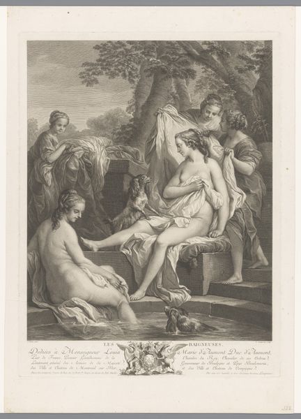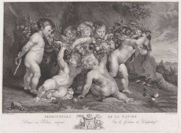 Charles Howard Hodges created this mezzotint, "Bacchanal with Silenus," sometime in the late 18th or early 19th century. The print plunges us into a densely populated scene of revelry, characterized by its monochrome tonality and dynamic composition. The figures emerge from a dark background, their forms modeled through subtle gradations of light and shadow. The composition seems to push against the frame, reflecting the unbounded energy of the depicted bacchanal. The figures are arranged in a diagonal sweep that pulls the viewer's eye from the lower-left to the upper-right, intensifying the sense of movement. Hodges uses the contrast between light and dark to define the forms, creating depth and volume. The classical subject matter, infused with the raw energy of the composition, destabilizes established meanings of beauty and order. It's a visual paradox that invites us to question the boundaries between chaos and structure, and perhaps reflect on our own cultural codes and values.