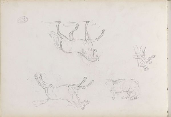 Editor: Here we have Gerard Bilders' "Studies van koeien," created with graphite and pencil on paper sometime between 1848 and 1865. I'm struck by how economical the lines are, capturing the essence of these animals. What do you see in this piece? Curator: The most compelling aspect is the interplay between form and void. Consider how Bilders utilizes negative space, allowing the untouched paper to define the contours of the cows just as much as the graphite lines themselves. How do these empty spaces affect the overall composition? Editor: They make it feel less like a complete picture and more like a collection of fleeting observations. The cows seem to emerge and recede, like glimpses caught in a field. Curator: Precisely. Observe the variation in the density of the pencil strokes. In some areas, the lines are barely perceptible, almost ghostly. In others, particularly in the head of the cow at the lower right, there is a concentrated build-up of graphite. How does this variation impact the perceived depth and texture? Editor: It creates a sense of dimension, giving that particular cow a greater feeling of presence. It makes her seem more solid compared to the others. Curator: Indeed. It highlights how through subtle shifts in tone and line quality, Bilders directs our eye and establishes a hierarchy within the composition. A structuralist reading would dissect these choices as carefully arranged signifiers. What, ultimately, do you believe is the impact of Bilders' methodology? Editor: I now understand how the visual presentation of these studies makes them so interesting, using the composition and tone to affect the meaning, not just the content. Curator: Yes, by analyzing the relationships between these formal elements, we can grasp the underlying structure of the artwork and appreciate the intentionality behind every mark.