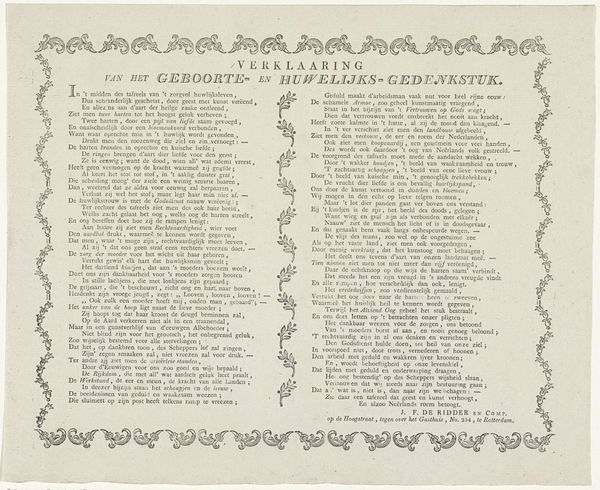 This is a print made in 1775 by Johannes le Francq van Berkhey and commemorates Willem V as patron of the Leiden Academy. The print is dominated by a dense block of text, framed by an ornamental border that adds a layer of decorative complexity. This immediately conveys the print's function as a formal declaration. The structure of the print, with its emphasis on text, reveals the period’s reliance on the written word as a primary medium for conveying knowledge and authority. The ornamental border, while decorative, also functions as a boundary, containing and emphasizing the text's importance. The use of elaborate typography and formal language underscores the print’s role in celebrating the academy. Consider how this piece destabilizes our modern expectations of visual communication; it challenges us to engage with language in a way that transcends mere reading, inviting a deeper consideration of the historical and cultural values embedded in its form. In essence, the print serves not just as a record but as an artifact that actively shapes and reflects the intellectual and cultural landscape of its time.