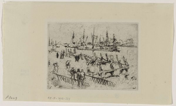 Editor: This is Muirhead Bone's "Rothesay Pier, No. 1" from 1899, made with etching and ink. The scene feels so immediate and alive. How would you describe the composition and technique at play here? Curator: Notice how Bone orchestrates a dynamic interplay of light and shadow, employing delicate yet assertive lines to delineate form and space. The etching technique, with its capacity for nuanced gradations, enhances the spatial recession and imbues the scene with atmospheric depth. Have you observed how the structural elements—the pier itself, the figures—serve as compositional anchors, guiding the eye through the visual field? Editor: I see it now. The vertical lines of the pier and masts, juxtaposed against the horizontal expanse of the sea, definitely create a sense of depth. The figures are almost abstracted. Curator: Precisely. The reduction of the figures to mere suggestion, achieved through economical mark-making, focuses our attention to the intrinsic visual architecture of the scene rather than anecdotal detail. The city in the background also provides a backdrop. What relationship exists between the cityscape and the pier? Editor: The city almost disappears, emphasizing the dominance of the pier, and drawing focus to the composition. I can almost feel myself standing there, soaking in the ambiance of a bygone era. Curator: An astute observation. The pier emerges not just as a physical structure but as a semiotic marker, a visual cipher encoding layers of meaning related to urban experience. What can you make of the blank space in the artwork? Editor: Well, it contrasts with the highly textured area where the crowd of people are assembled on the pier. Maybe it gives the crowd more depth? Curator: Bone directs us to evaluate the artist's formal construction, emphasizing its visual form through light, structure, and shadow, not merely representational skill. Editor: That’s so helpful. I’ll definitely be looking at etchings with a fresh eye now.