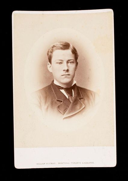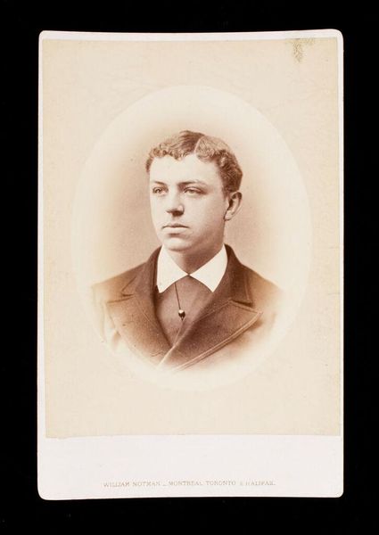 Curator: Before us is a cabinet card portrait of James Wade Gaff, who died in 1889, captured by William Notman. There is a certain solemnity here. Editor: Yes, the oval vignette and sepia tones lend it an antique, almost ghostly air. I wonder about the performative aspects of portraiture in that era and how it shaped identities. Curator: Well, Notman was a very successful commercial photographer with studios across Canada. Gaff's image circulated, contributing to his public persona. The gaze, slightly averted, speaks to notions of bourgeois masculinity. Editor: It's a carefully constructed image. I am curious about the politics embedded within it and how Gaff's identity was potentially shaped, but also constrained, by such representation. Curator: Indeed, analyzing these portraits allows us to deconstruct the social and political climate of the time. Editor: It's an intimate glimpse into the past, but also a reminder of the power structures inherent in image-making.