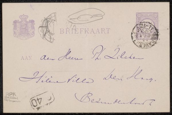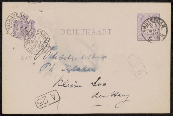 Editor: So, we're looking at a postcard: "Briefkaart aan Jan Veth," made before 1897 by George Hendrik Breitner. It seems like a pretty ordinary piece of correspondence, almost ghostly in its simplicity. What jumps out at you? Curator: Oh, it’s absolutely charming, isn't it? It whispers of a slower pace of life, where a handwritten note was a valued form of connection. But look closer, it's more than just a mundane message. Imagine Breitner, known for capturing the bustling streets of Amsterdam, taking a quiet moment to pen this. The stamp, the delicate handwriting...it's like a tiny time capsule. Do you think it tells us anything about Breitner’s world, away from those bustling streets? Editor: Hmm, perhaps a glimpse of his personal life? I see it was addressed to Jan Veth. Was he a fellow artist? Curator: Indeed! Veth was a prominent artist, critic, and art historian. Perhaps Breitner sought his advice, or maybe they were just close friends. The very act of sending a *brief kaart*, a little card, suggests an intimacy. The economy of words too...almost as if the connection transcends needing lots of them. Doesn't the modesty in presentation hint at a confidence, an understanding, between artist peers? Editor: That's a lovely thought! It completely changes my initial interpretation. What began as something mundane now feels imbued with friendship and mutual respect. Curator: Exactly! It's those hidden narratives that truly bring art to life, isn't it? Each element offers clues. These mundane objects, often overlooked, unlock surprising insights into art and human interaction.