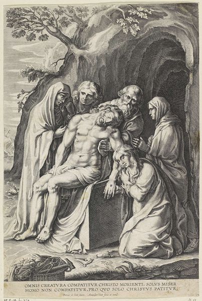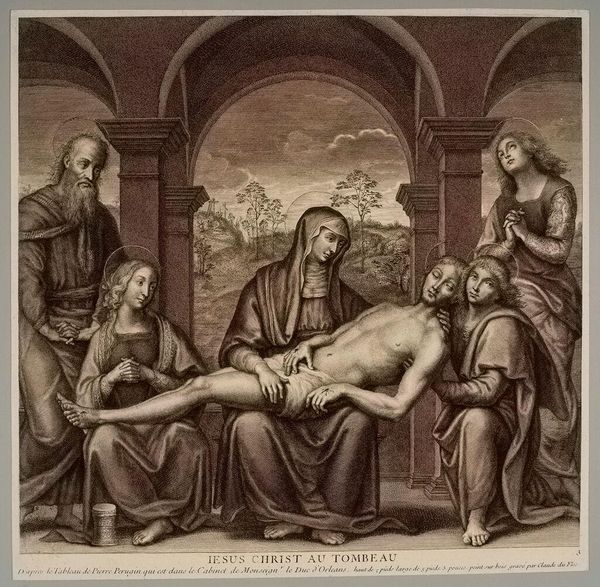 Claude Duflos created this print, Christ in the tomb, resting across the Virgin's lap; after Perugino, sometime between the late 17th and early 18th centuries. It reflects a period when religious art was employed to reinforce societal norms and moral values. Here, the Virgin Mary cradles the lifeless body of Christ, surrounded by mourners in a scene imbued with grief. The image suggests a certain idealized vision of femininity, where women are cast as the primary bearers of sorrow and compassion. Duflos’ choice to reproduce Perugino’s original image, speaks to the enduring appeal and cultural significance of such representations. The print invites reflection on the emotional and spiritual dimensions of faith. The idealized figures may not fully capture the complexities of human suffering, but it invites viewers to contemplate the themes of sacrifice, mourning, and the promise of redemption.