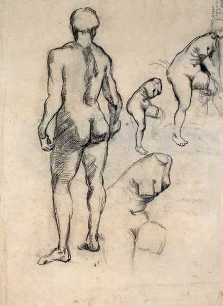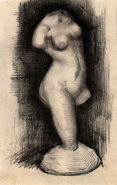 Editor: This is Vincent van Gogh's "Young Slave," a charcoal drawing from 1887 currently residing at the Van Gogh Museum. It depicts a nude statue, seemingly a study of form. The sharp lines give it a somewhat unsettling feel, almost as if it's not fully there. What can you tell me about this piece? Curator: It’s interesting to consider this within the context of Van Gogh's artistic development and the broader academic art world. This drawing is not simply about depicting the statue. The 'Young Slave', was a piece produced to demonstrate proficiency and understand anatomy through the lens of socio-political understanding of slavery during 19th century academic practice. Do you see how his choice of medium impacts this intention? Editor: The charcoal definitely adds to the unfinished, almost ghost-like quality. Does that reflect any specific artistic or societal attitude at the time? Curator: Precisely! Consider the purpose of academic art in that era – the institutions and patronage systems. There was a specific mode for training to create great art and van Gogh took classes, even though the process did not particularly match his personality. By portraying a classic subject like slavery within this style and with an incomplete sketch-like medium, do you believe it could critique the institution of academic drawing as well as explore subjectivities? Editor: I hadn’t thought about it that way. I suppose by leaving it "unfinished," he's perhaps questioning the rigid standards, the public perception, even in the form and training itself? Curator: Exactly! He appropriates a loaded classical form and subverts its function within the contemporary societal constructs. Editor: So it is less about the form and more about what it represents, given when and how it was made. Curator: Indeed, analyzing "Young Slave" unveils much of Van Gogh's social consciousness within art. Thank you for a good discussion! Editor: This was insightful; I'll never look at academic art the same way.