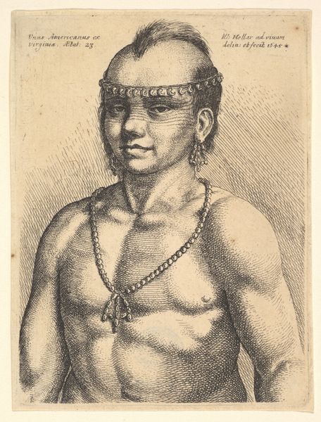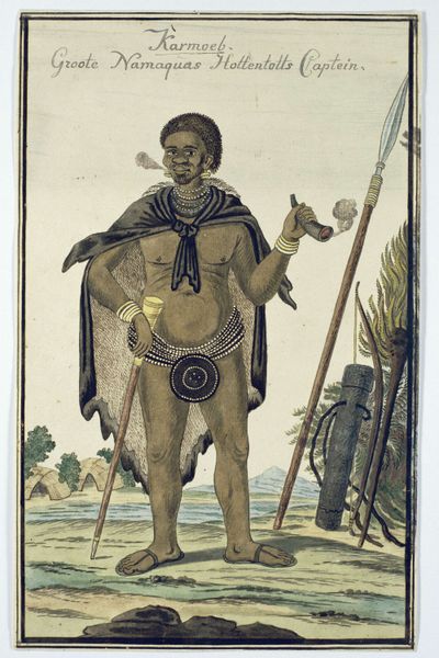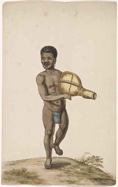 Editor: Here we have an intriguing artwork titled "Chinese handwerksman met parasol en scheermes," or "Chinese Craftsman with Parasol and Razor," dating back to somewhere between 1675 and 1725, created by an anonymous artist. It's a watercolor painting. It’s quite striking, almost like a caricature, and I’m curious about its blend of orientalist and surreal elements. What do you see in this piece? Curator: The initial aspect that captivates is the curious formal arrangement of the figure within the pictorial space. Note how the parasol bisects the composition diagonally, creating two distinct zones. One zone is the figure’s body itself, almost neoclassical in its sculpted form. The other, defined by the space around the parasol, provides textural and linear contrasts, which create visual intrigue. Have you noticed the tension between precise watercolor technique in the depiction of musculature, contrasted by the quick, almost haphazard washes in the figure's lower garments? Editor: I see what you mean, especially with the tension between the precision of the torso and the looser treatment of the rest of the figure. What is that suggestive of in terms of semiotics? Curator: Formally, these artistic decisions evoke a discourse between control and spontaneity. The interplay encourages the viewer to ponder if this represents more than a simple visual recording. Note too the deliberate bareness of the upper torso with the contained composition and colour in the face; it brings your eye back there time and time again. Editor: It's fascinating how dissecting the composition reveals layers of meaning beyond the immediate image. Curator: Indeed. Close formal reading guides our experience and thought, showing how complex even seemingly simple works can be. Editor: Thank you. I feel that I can see so much more clearly now!
