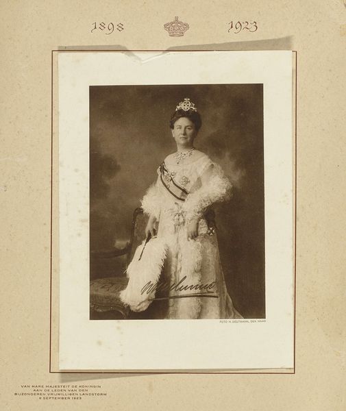 Editor: Here we have Herman Deutmann's photograph, "Portret van Wilhelmina, koningin der Nederlanden," dating from between 1920 and 1926. It’s a striking portrait, very regal of course, but almost… staged, in a way that makes her seem a bit distant. What do you see in this piece, especially considering the historical context? Curator: I see a careful construction of power, steeped in symbolism. Consider the ermine, the tiara, the sash – each a visual shorthand for monarchy, a deliberate performance of dynastic continuity. The photograph captures Wilhelmina during a period of great social change. How might the imagery used here function as a statement of stability and tradition in a changing world? Editor: That makes sense, the symbols reinforce tradition. It almost feels like the weight of the crown, and everything it stands for, is very tangible in this portrait. Curator: Exactly. But what about the background, that soft-focus blur? It is a stage, as you observed earlier. What emotional impact does this have, beyond simple regal authority? Is it distancing? Comforting? Is she framed against nothing but her own importance? Editor: It adds to the feeling of distance, I think. It’s as if she’s intentionally separated from the everyday world. So the photograph, as a whole, tells a very specific story about power and image. Curator: Precisely. The image actively engages with visual vocabularies related to power and history. Reflect on how portraiture, photography and regalia converge to solidify monarchy for both domestic audiences and collective global memory. Editor: That’s a completely different way of looking at it, thinking about the conscious choices and what they represent culturally and psychologically. I'll never see these royal portraits the same way!