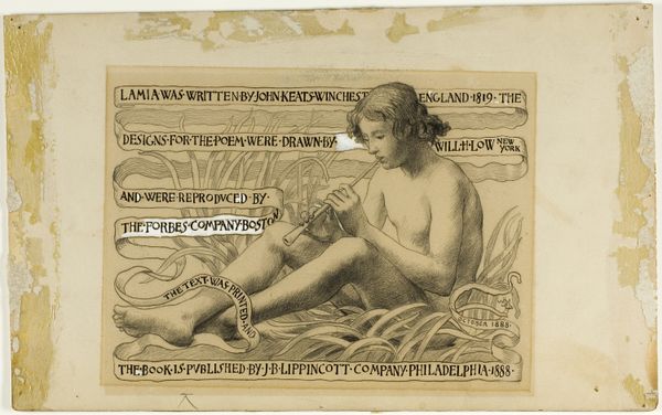 Will Hicock Low created this artwork, Odes and Sonnets List of Drawings, using graphite and gray wash on paper. The sepia tones create a nostalgic and serene atmosphere. A reclining nude female figure is framed by natural elements and floating banners. The overall composition invites us to consider the interplay between the classical and the contemporary. Low uses the female nude as a focal point, drawing from classical artistic traditions. The figure's soft contours and relaxed pose create a sense of harmony and grace. Yet the inclusion of banners with text disrupts the traditional idyllic scene. The text introduces a modern element, juxtaposing the timelessness of the nude figure with the specificity of language and communication. This juxtaposition destabilizes the conventional symbolic meanings associated with the nude, prompting a re-evaluation of its place within the modern context. The formal interplay between figure and text highlights the changing modes of representation and communication at the turn of the 20th century. This piece encourages us to interpret and re-interpret our cultural values.