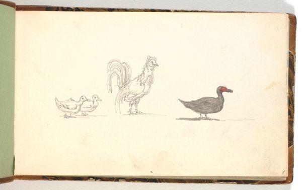 This drawing, "Kippen op een erf," by Cornelis Saftleven presents three chickens in a humble yard, rendered with graphite and light washes. The composition is striking for its use of line and form to convey texture and depth. The varying orientations of the chickens create a dynamic, shifting perspective, challenging our fixed understanding of space within the picture plane. Saftleven uses subtle variations in line weight and shading to distinguish the forms of the chickens. Observe how the soft, feathered bodies contrast with the angular lines of the dilapidated brick structure in the background. The drawing complicates traditional genre scenes. The chickens, typically subjects of still life or minor details in larger compositions, take center stage. This elevation of the mundane, combined with the raw materiality of the graphite, disrupts conventional artistic hierarchies. The drawing invites ongoing contemplation of the boundaries between high and low art, challenging us to reconsider the aesthetic and cultural value we place on the commonplace.