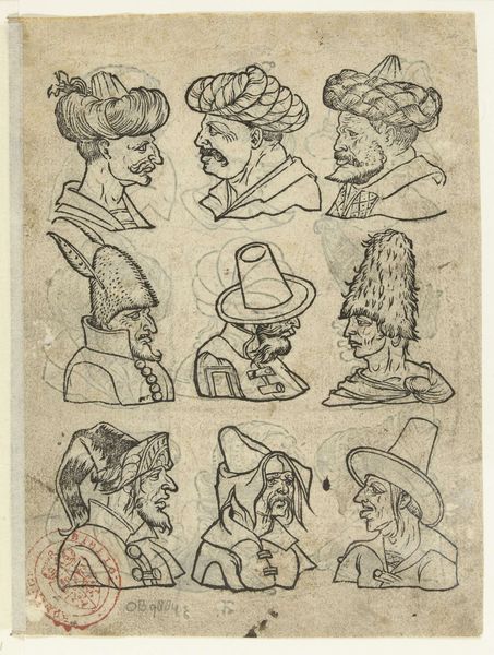 Curator: This engaging work is titled "Negen mannenhoofden met verschillende soorten hoofdbedekkingen, zoals tulbanden," which translates to "Nine Male Heads with Different Types of Head Coverings, Such as Turbans." It's an ink drawing, made with pen, from sometime between 1500 and 1568. Editor: It has such a fantastical quality. I'm immediately struck by how theatrical all the headwear is; each seems to invent its own logic and demands attention. The detail, for being simple line work, evokes such a range of characters. Curator: Yes, consider the material limitations overcome here: using just pen and ink, an anonymous artist achieved incredible detail, texture, and variety in these head coverings. It also raises the question of production – was this preparatory work? Was it study from observation, a sampling of costume perhaps, or was it simply an exploration of craft and artistry? Editor: Given the range of turbans and other headwear, the drawing might reflect a fascination with diverse cultures, possibly documenting interactions or even anxieties around foreign communities within Europe at that time. How does the depiction of these men – presumably imagined, given the anonymity of the work – speak to power dynamics? Curator: Absolutely, the paper itself – its production, cost, and availability – determined the scale and detail possible in this drawing. Furthermore, the accessibility of ink compared to other drawing mediums certainly facilitated its creation and distribution as potentially a workshop drawing passed between different makers or studios. Editor: The concept of ‘the head’ in portraiture is so interesting, then layered by cultural and religious symbolism implied in the hats! These aren't just portraits; they are statements. Even in this somewhat raw sketch form, the social weight of attire comes across. It feels like the artist might have wanted to depict the individual, as he also portrays the character, or a theatrical figure, behind. Curator: Precisely. Understanding this from a materialist approach asks us to remember the very physical work that went into each pen stroke, consider the light in which this piece would have been made, or shared, which leads us back to these complex identities you've helped explore and appreciate! Editor: I appreciate that! Hopefully, our viewers now understand a bit more about what histories an image like this one encapsulates.