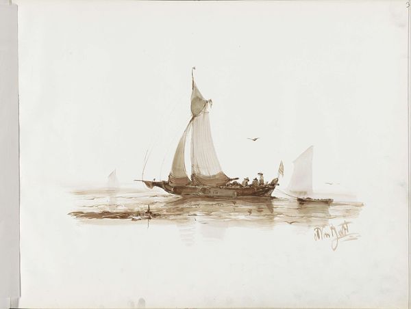 Editor: Here we have George Canning Wales' etching from 1929, “Coming out of Marblehead.” The detail is striking—look at how the ship mirrors in the water! It feels calm, serene, almost like a memory. What captures your imagination when you look at this piece? Curator: It's a quiet power, isn't it? Like the feeling of standing on the shore, the salt air, the cries of gulls—all held in a single breath. For me, it's that dance between realism and something almost ethereal. See how he uses those delicate lines, particularly in the reflection? It suggests a deeper reality, not just what's on the surface. What does it say to you about this time in America? Do you find anything missing, maybe, something you yearn for that the artist leaves out? Editor: I feel the nostalgia for this early American sailing life, though I don't know if it really existed! What’s particularly interesting is the emptiness. The scene seems almost post-apocalyptic because, other than the sailboat, the composition is quite stark, simple and clear. It’s dream-like, I guess? Curator: "Dream-like," I love that. Perhaps it *is* a yearning. Wales wasn’t just documenting a scene; he was curating a feeling. A longing for a simpler time, perhaps, or a reflection on the transient nature of things. What stays with you when you look away? What echo does it leave in your mind? Editor: Definitely a sense of peace. The geometry juxtaposed with the freedom of the open sea – it's a powerful combination. Thanks, that really opened up my eyes to appreciating the subtlety! Curator: And you've sharpened my appreciation for that delicate balance – a picture about stillness also brimming with potential movement. Beautiful, really.