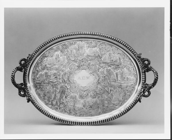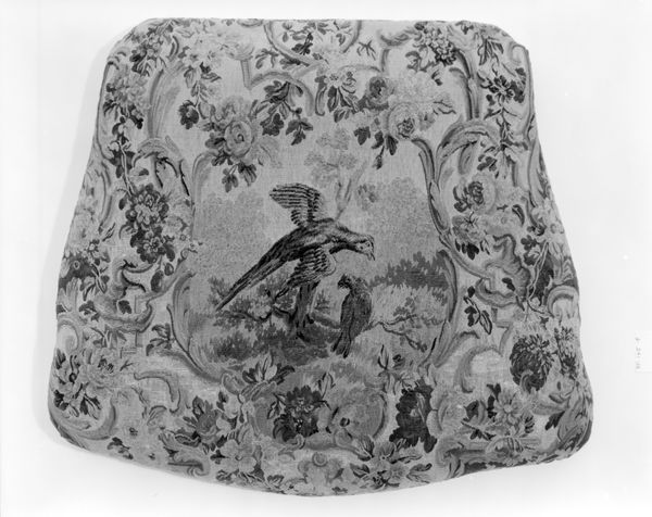 Curator: Oh, what a charming scene! It's lighter than I expected, somehow buoyant. The details of the tapestry, so meticulously rendered, soften the edges. Editor: Indeed! What we’re looking at is an armchair seat, crafted in France sometime between 1754 and 1756. It was made in Beauvais and now resides here at the Metropolitan Museum of Art. Curator: Beauvais, naturally! One expects this sort of Rococo delight from them. Tell me more about what’s depicted; my eyes are immediately drawn to those rather engaging rabbits at the center. Editor: Ah yes, the rabbits. In the center, nestled within what looks like a small pastoral scene, are a pair of bunnies, while the perimeter boasts a riot of meticulously woven flowers. We can’t ignore the wider social context: imagine the seat, likely part of a larger suite, residing in some aristocratic salon, broadcasting messages of pastoral leisure and refinement. It projects a vision of cultivated nature, deliberately distancing itself from the realities of rural life for the elite. Curator: And isn’t that central tension so characteristic of the Rococo period? These charming symbols also point toward deeper resonances, of fertility, perhaps, or innocence. The decorative border feels almost protective, nurturing the central vignette, elevating the entire composition beyond mere utility. The bunnies are emblems, visual shorthands, reminding us of a perhaps longed-for simplicity, safely domesticated. Editor: It's the artifice that always captivates me, and yet the weavers masterfully use naturalism, but with distinct commercial considerations, a piece like this reinforced social standing, solidifying class and expressing access. Curator: Quite, and looking beyond the material, it embodies the cultural dynamics of its time, inviting contemplation on leisure, wealth, and visual narrative within domestic spaces. It also demonstrates artistic prowess with wool and silk. Editor: Agreed. Ultimately, its symbolism and purpose have shaped an intricate visual language that speaks volumes about art, social structure and human aspiration across time. Curator: Indeed! An era perfectly captured in the small frame of a seat.