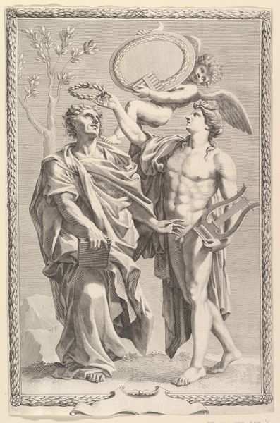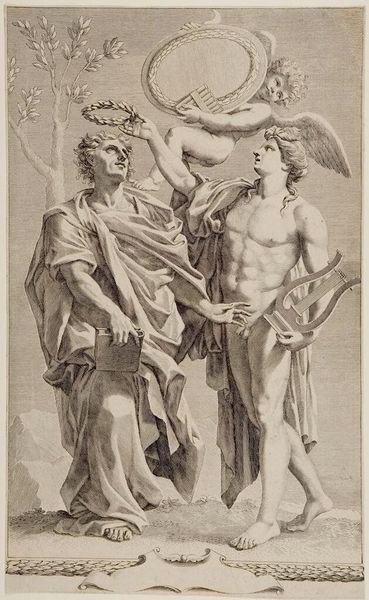 Editor: This etching is called "Saint Martin and Beggar," made sometime between 1561 and 1604 by Zacharias Dolendo. It's striking how the artist contrasts the strong, armored figure of Saint Martin with the vulnerable, almost desperate pose of the beggar. How would you interpret the dynamics at play here? Curator: Considering the historical context, prints like these were instrumental in shaping public perceptions and disseminating ideas. This image isn’t just a religious scene; it's a carefully constructed allegory. The saint’s act of charity serves a didactic purpose. What do you think about the display of wealth versus poverty? How would it affect the audience who viewed it? Editor: I guess it's a pretty powerful statement. I see the generosity, but the inequality between these two individuals is pretty intense. Almost performative? Curator: Exactly! Mannerism, the artistic style here, favored artifice. That's evident in the exaggerated musculature and the theatrical poses. So how might that stylistic choice itself be a political statement, shaping how charity and power are perceived? Were you thinking of the church or royalty when you used "performative?" Editor: Well both. Now that I consider it, the detail of their muscles and dramatic display feel like propaganda rather than selfless charity. Curator: Precisely! Artists at this time depended on commissions and patronage. By situating Saint Martin within a Mannerist aesthetic, this work isn't just telling a biblical story but reinforces existing societal structures. Art can then function not just as visual delight but to advance an agenda of moralistic social order. Is this helping you? Editor: Definitely. Thinking about the audience at that time helps put everything in perspective. It's much more complex than a simple act of kindness, right? Curator: Exactly. This artwork and historical context challenge simplistic interpretations of art, revealing its function within social power dynamics. It has helped me! Thank you!