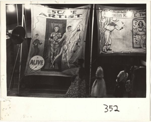 Editor: This gelatin silver print from 1938, titled "Performance van drie heren. Surrealisme-tent. Gal. Robert, A'dam 1938," by Lilly Samuel… it has such a bizarre, theatrical feel. There are so many elements fighting for attention! What can you tell me about it? Curator: This photograph, positioned as a “performance,” calls our attention to the means of art production itself. Consider the materials—the gelatin silver print, the physical construction of the “Surrealisme-tent”... it suggests a deliberate deconstruction of artistic creation as something crafted and performative rather than purely inspired. Notice, the gallery becomes a production site. How do you see labor reflected? Editor: Well, there's definitely labor involved in assembling this whole tableau: the mannequin, the painting in the background, the deer head... even the men themselves are arranged like objects. Curator: Exactly. It disrupts conventional art gallery presentations, redirecting our focus to what an art space is materially and socially, highlighting that artwork requires organization of materials and resources. Even those involved, down to their dress and posing. Editor: I hadn't really thought about the photograph itself as a kind of material documentation of the performance... like the creation isn’t just what’s in front of the camera. What would they have used to illuminate the figures? What sort of developer chemicals might have created that tonality? Curator: Precisely. It transforms from representation to documentation. Consider the labour of early gelatin silver prints compared to our world today. A piece like this really allows us to question traditional notions of artistic value and celebrate the making process, doesn't it? Editor: Absolutely. It definitely challenges the romantic idea of the artist as a solitary genius. Thanks; I'll definitely view art installation differently now. Curator: My pleasure! Thinking through materiality always gives another lens to value art, don't you think?