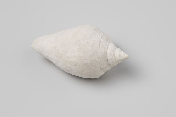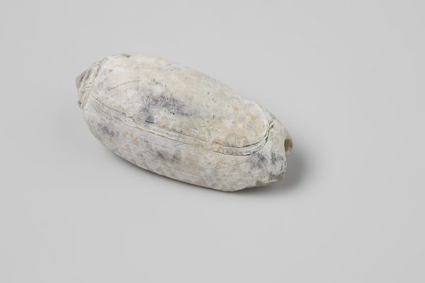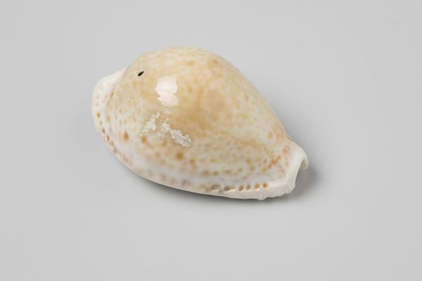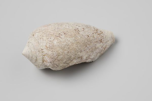 Curator: Looking at this object, the first thought that springs to mind is a weathered river stone, softened by ages of flowing water. It appears incredibly tactile and elemental. Editor: Indeed. What we’re viewing here is a photograph of an Erosaria spurca shell, taken sometime before 1613. The shell itself was recovered from the wreck of the Witte Leeuw, a Dutch East India ship that sank off St. Helena. Curator: A poignant relic of a maritime disaster. Its color, though muted now, hints at the vibrant hues it may have possessed, evoking themes of distant lands and exotic trade. Is that shell's name an intentional association with romantic love? Editor: In a way, yes. The Venus shell, as its more commonly known, bears an etymological relation to Aphrodite, the Greek goddess of love, and Venus, her Roman counterpart. Such shells, often linked to femininity and fertility, enjoyed symbolic use as amulets, promising safe voyages or blessings on marriage. They would be treasured by seafarers in their worldly pursuits, bringing these ideals abroad. Curator: A stark reminder of the human drama embedded in global trade. This small shell embodies enormous cultural and psychological weight: adventure, danger, romance, and the constant human effort to secure fortune. I wonder what the sailor that had this on board would have thought of it being displayed in a modern-day museum. Editor: I find the history equally compelling. To consider its presence within the Rijksmuseum now prompts me to think about Dutch Golden Age trade routes and the complex dynamics of colonial ambition. The still life itself reminds us to consider what items survive of history and who dictates how it is remembered. Curator: A fascinating consideration, especially when holding within it's very structure all these layers of metaphorical weight from centuries ago! Editor: Precisely! The shell speaks volumes about cultural exchange, personal hopes, and the enduring power of symbols. It truly holds within it the depths of human experience.