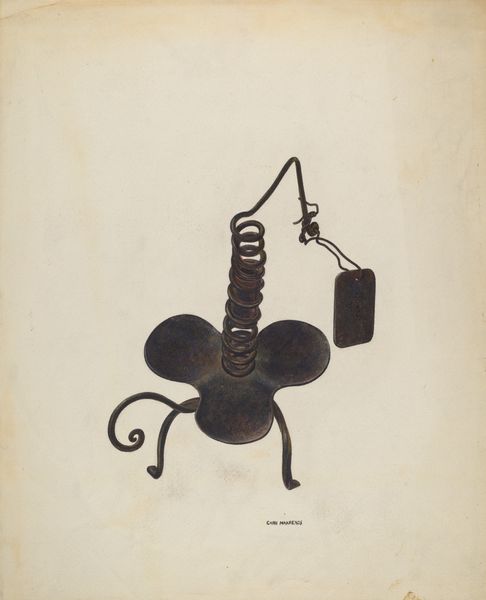 Curator: Well, here we have William Hoffman's "Hoe Blade," circa 1941. It's a striking example of his work in watercolor and drawing. Editor: My first impression is one of quiet dignity. It’s an everyday object, isolated against this warm beige background, almost monumental. Curator: Exactly. The visual isolation allows us to really focus on the object itself – the soft gradients of color rendering a sense of three-dimensionality that speaks volumes despite the object’s stillness. How does the texture work for you? Editor: There is something powerfully evocative in its depiction here. It's more than just a farm tool; it represents a specific class in society—those tied to the land through hard manual labor, the ordinary folks, if you will. This isn't simply about showing off technical prowess; it is deeply sociopolitical. Curator: A valid reading. Yet I'd add it goes beyond any immediate historical commentary. Hoffman's meticulous construction—the interplay of curves in the upper handle against the sharp edges of the blade—imbues this ordinary tool with an abstract sculptural presence. One may argue he almost depersonalizes it, removing a degree of connection with social realities of the day. Editor: I am less certain that Hoffman distances himself, perhaps he’s attempting to honor a segment of the population with his close, even monumental, examination of their everyday labor. Did Hoffman specifically acknowledge a commitment to social commentary? Curator: Historical records provide minimal explicit statements of Hoffman’s explicit commitment. Instead we could consider a pure, direct realism that forces us to examine beauty in unlikely, utilitarian forms. The work resonates by showcasing its elemental shape. Editor: Perhaps, but art rarely exists within a vacuum, especially depictions of objects linked so strongly to rural communities, the rise of regionalism, and the American scene painting movements during the Depression. These factors inherently add complexity. Curator: Regardless, I am thankful we can analyze how Hoffman allows the mundane to speak volumes about structure and composition. It showcases how form becomes just as important, perhaps even supersedes historical intent. Editor: Agreed, our considerations ultimately deepen the visitor’s engagement with the complexities inherent to interpreting art, beyond the purely visible.