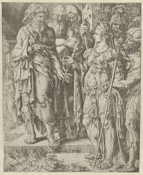 Editor: This engraving, "Salomo's Afgoderij," created in 1551 by Dirck Volckertsz Coornhert, seems to depict a moment of high drama. The figures are incredibly detailed with flowing lines, and it almost has a chaotic, swirling energy. What catches your eye in this piece? Curator: The linear precision is remarkable, isn't it? Note how Coornhert utilizes line weight to suggest depth and shadow, especially in the drapery. The composition is structured by strong vertical and horizontal lines – the steps, the figures themselves. What effect do you think the artist was aiming for by employing this structured framework, despite the busy scene? Editor: Perhaps it's meant to create a sense of order, a hierarchy? There is a queen at the center, raised up on stairs, seemingly more important. How else does this influence the mood? Curator: Precisely. Now observe how the figures’ gestures create diagonals that intersect these primary lines, adding tension and directing the viewer’s eye. Do you think that these intersecting diagonals serve any visual or structural purpose within the piece's formal properties? Editor: I hadn’t considered that, but I see it now! It creates a kind of visual push and pull, emphasizing certain areas and adding energy to the scene. I find the foreground intriguing with the discarded armor. What function might this collection of shapes play in relation to the queen standing higher? Curator: Exactly. These foreground elements create visual interest and guide the eye upwards towards the central figures. We can also consider the use of contrasting textures achieved through line variation to be quite important. Editor: Thank you, looking at it from a formalist point of view helped me to understand some visual clues I wasn't seeing. Curator: Indeed, by considering only the intrinsic elements within the piece, we gained a new perspective!