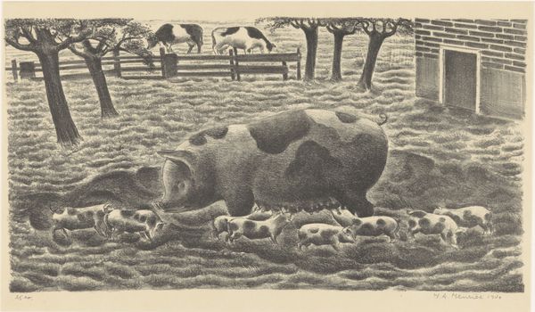 Curator: Alright, so looking at this print, a woodcut actually, made by Homer Boss around 1930, what strikes you first? It's titled “Untitled (Man Gathering Rock From Seashore, With Ox-Cart)”. Editor: Immediately, I feel this weighty stillness. It's black and white, so stark, and yet that ox looks like it's carved from marble—like a god forced into labour. Curator: You see the divine in the mundane? It is interesting how he rendered that ox. The figure of the man laboring definitely speaks to me of work. Look at how he uses these really simple tools, yet they still convey such emotion. Editor: Absolutely. And the way the woodcut captures texture—those pebbles on the shore become this endless field of dark and light. It makes me think of Sisyphus, eternally pushing his boulder, except here it's smaller rocks but the labour feels just as monumental. A meditation on unending tasks? Curator: Interesting. The waves, the clouds even—everything seems horizontal. Is that contributing to your feelings of stasis? Do you get a feeling about the horizon here, the symbolic power? Editor: Oh, definitely. All those horizontals feel oppressive almost. That low, heavy sky… And then you see the ox, this hulking form, and it's like an anchor holding everything down. Ox as enduring strength, but also enduring burden. Curator: Woodcuts, prints of any kind I guess, are inherently repetitive. Here, that feels built into the theme—that repeated labour, repeated marks creating this image of unending work... the way the prints get made parallels the life the work is reflecting. Editor: It all comes back to the inherent connection. Yes, there's something profound in the cyclical nature of it. The sea, the sky, the gathering, the carting, the rocks... All part of the eternal grind. You see that same theme echoed through history in so many different stories! The hero, the quest, the toil... and Boss finds it right here, on a shore. Curator: Yes! Okay, Homer Boss. Thank you for this tiny meditation on life. Editor: Yes. Thank you, indeed. The weight of the world visualized so economically. Powerful stuff.