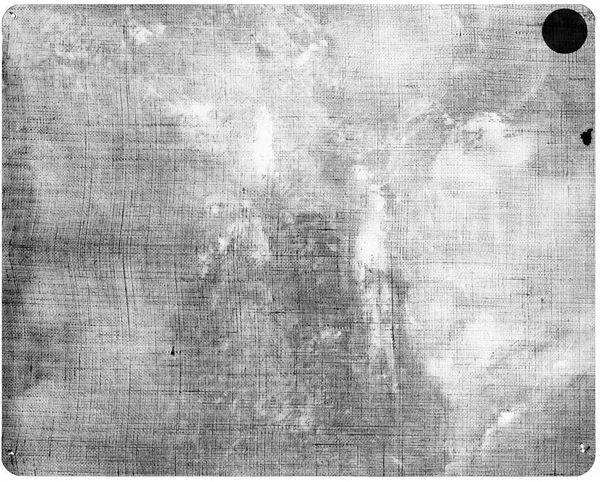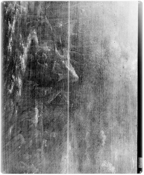 Editor: This is an X-radiograph of "Stream with Deer," originally by Alexander Helwig Wyant. It's so interesting to see the layers beneath the surface. What does this reveal to you? Curator: The x-radiograph exposes the material history. We see the support—the canvas weave, any repairs. How does understanding this hidden structure change your perception of the finished painting and the artist's process? Editor: It makes me think about the labor and the physical process of creating art. Almost like an archeological dig. Curator: Precisely. It shifts the focus from the illusion to the reality of the artwork's construction. It reminds us of the material conditions of art production. Editor: I hadn't considered that before. It gives me a whole new appreciation for the work that goes into painting. Curator: Indeed, revealing the physical layers is key to understanding the complete story of the piece.