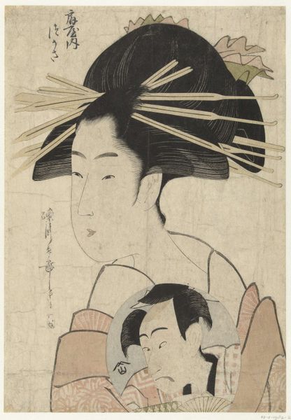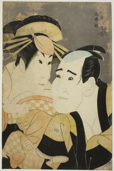 Editor: This woodblock print, "The actors Sawamura Sojuro II as Satsuma Gengobei and Arashi Ryuzo II as Mawashi-otoko Yasuke...", created around 1795 by Utagawa Toyokuni I, captures a tense moment. I’m really struck by how the artist uses line and color to create such dramatic tension between these two figures. How do you see the artist's choices influencing the artwork's meaning? Curator: What I see here are the markers of its making, right? Look at the lines - those are not just lines; they are the record of the artisan, of labor. The woodblock print process itself – the carving, the inking, the pressing – speaks to a specific mode of production and dissemination of images in 18th century Japan. The materials – the wood, the ink, the paper – where do they come from? What are their trade routes? This impacts how the image then reaches a wide audience beyond the elite. This is a popular art form depicting popular actors, think about that for a minute. Editor: So you are saying the accessibility of the medium impacts the subject matter and reception? Curator: Exactly. Consider also the social context of kabuki theater itself. The actors were celebrities, but often came from lower social classes. This image both reflects and reinforces that societal tension. How is class depicted through costume and gesture here? Editor: The details in the robes do suggest status. Also, I didn’t even think about it until you mentioned, but prints, inherently, can be reproduced for wide distribution... Curator: Precisely. This isn't just a record of a performance, but a manufactured commodity, part of a larger system of entertainment and consumption. So, seeing the production of this print makes me rethink how it impacted its historical perception, but even its cultural status today. Editor: That really reframes how I’m looking at the piece – from just an artistic representation to something deeply embedded in the socio-economic structures of its time. Thank you.