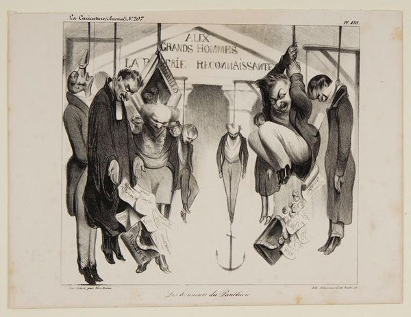 Editor: Here we have Honoré Daumier's "The Pleasures of the Carnival". The stark contrast of dark lines against the pale ground creates a very busy composition, making it almost claustrophobic. What structural elements stand out to you? Curator: The dynamic interplay between the foregrounded spectators and the elevated performers is intriguing. Note how Daumier uses line and form to create a sense of depth, while simultaneously flattening the image. Consider the semiotic weight of each figure, their posture, their relationship to the mass. Editor: So, you're seeing the composition itself as a commentary? Curator: Precisely. The density of the crowd versus the elevated stage presents a visual hierarchy. We are meant to consider the relationships implied by Daumier's compositional choices. Editor: That's a perspective I hadn't considered. I was so focused on the figures, I overlooked how their arrangement shapes meaning. Curator: Close visual analysis reveals so much.