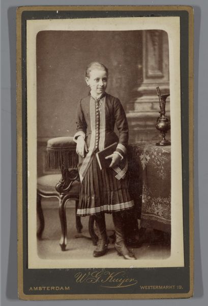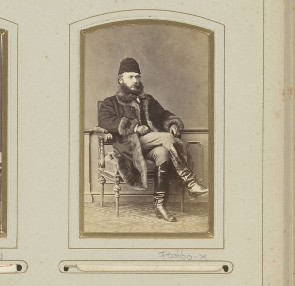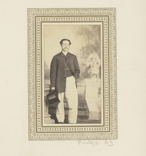 Curator: Here we have an albumen print dating from 1850 to 1880, entitled "Portret van Hadjie Hina Sagaf Neep te Singapore". It's an impressive example of early portrait photography. Editor: My immediate reaction is how self-assured this man looks, almost confrontational. There’s a strong verticality in the composition, anchored by the column. Curator: Indeed. The column itself becomes a fascinating symbol, suggesting stability, perhaps even status and knowledge. The sitter's relaxed pose, leaning against it, could indicate that these are the pillars upon which his identity rests. Editor: I agree; it establishes a visual hierarchy. His gaze meets ours directly, an element reinforced by the dark jacket that visually pops against the pale trousers and sarong-like cloth. Notice the intricate details—the textures, the jewelry, the cane—each speaks volumes. Curator: Consider how accessories amplify social identity. The cane could symbolize sophistication, the ring affluence, and his attire indicates a cultural hybridity reflecting Singapore’s history as a port city with global links. It provides hints toward psychological profiling that also shows the man to be confident, but with just a hint of weariness about the world, in my eyes. Editor: An astute point. While his attire might signal status, it's not without its structural complexities either. The carefully draped cloth, juxtaposed against the Western-style trousers, create an interplay of patterns that guide our attention. He becomes the center through these stylistic contrasts. Curator: Yes, this points to a dialogue between different worlds. It begs the question about identity, particularly within a colonial context. I am struck with his confident self presentation that defies the orientalist trope often adopted when picturing non-Europeans during this historical era. Editor: A powerful observation! Perhaps the real triumph of the photograph lies in capturing this very tension. It seems to negotiate identity through composition, detail and tone, becoming a record that is much more intricate than it may seem at first glance. Curator: It certainly leaves a lasting impact by preserving his identity in the face of rapid societal change, and in the language of that particular moment. It has been interesting reflecting on how those nuances contribute meaning for a contemporary audience like ourselves. Editor: Agreed, our exploration, through its visual components, unveils layers of cultural memory, adding complexity to what might be an ordinary encounter. It goes to prove how enriching even older works still are today.
