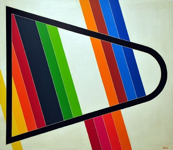Curator: Welcome. Here we have Alexander Calder’s painting, *The Green Stripe,* created in 1963 using acrylic paint on canvas. What strikes you first about it? Editor: Its playful nature jumps out immediately! The bold, primary colors are instantly appealing, and the way the stripes seem to cascade downwards creates a real sense of movement and joyous spontaneity. It also feels very modern. Curator: That dynamism definitely defines Calder’s work across various media. Given its production year, what socio-political currents might have shaped this particular canvas and how would that interact with modern notions? Editor: The 60s were a time of massive cultural shifts and social upheaval. Considering Pop Art’s emergence alongside increasing political activism and calls for change, "The Green Stripe," with its energetic abstraction, visually resonates as freedom in an art context! Perhaps a demand to overturn formalist artistic structures and strict hierarchies of that art establishment as well. Curator: Yes, absolutely. We must remember the gallery spaces themselves had deeply embedded social and political influences on displays and curation choices. "The Green Stripe’s" reception depended entirely on institutional perspectives. How do you feel his background of creating works beyond typical “paintings” would be taken up? Editor: I wonder if Calder’s exploration with mobiles freed him to reimagine painting. This translates to a composition devoid of the typical weight and seriousness expected of pre-war abstract paintings. By taking inspiration of textiles, the work perhaps defies rigid categorization, becoming a commentary itself on fluidity. Curator: Indeed, the intersections of different mediums, from mobiles to painted works on textiles, reflects a challenging spirit towards categorization, a critique of predefined roles. In looking at the museum display in our contemporary view, Calder presents something refreshingly free. Editor: Considering what has become museum environments through years of the pandemic, these bright shades on the canvas and seemingly haphazard line-work can offer some cheer for all visitors today. Curator: That’s beautifully put. Ultimately, "The Green Stripe" invites each viewer to weave their personal story, emotions, and understanding of art spaces and our contemporary culture to discover their own truth in that canvas.