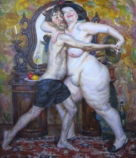 Curator: Here we have Viktor Lyapkalo’s “Samovar,” painted in the year 2000. The piece appears to be oil on canvas and features two figures enjoying what seems to be a post-sauna tea break. What are your initial impressions? Editor: Well, my first thought? “Bathing with friends!” It's wonderfully unvarnished, like stepping into someone’s memory. There's a sort of raw intimacy, a sense of bodies relaxed and unposed after the heat...plus that golden samovar smack in the centre radiates pure coziness. Curator: Absolutely. Lyapkalo, though rooted in realism, captures an unidealized humanity that connects strongly to genre-painting. We see references to a communal aspect of post-Soviet domesticity: bathhouses as social spaces. Notice the detailing— or, rather, the lack thereof. Everything points to feeling rather than academic precision. Editor: You said it! Check the man's hairy chest and that dangling cigarette...pure 'attitude'! And then, opposite him, the woman – unapologetically herself. Lyapkalo paints flesh with such affection. It reminds you that beauty doesn’t always mean ‘perfection,’ but warmth and confidence, right? There's zero pretense. I dig it! Curator: Indeed. Also, observe how he positions the objects – the samovar, teapot, the fruit–almost still-life elements amidst this figurative piece. Considering Russian social norms regarding body image, such overt depiction borders on subversive in art history, as if to mock conventions of representation of idealized bodies. Editor: Subversive and joyous! Maybe because in those raw curves, awkward postures, you recognise yourself. Art becomes a mirror...a far kinder mirror than most! And to me that samovar is just a comforting metaphor – bubbling warmth after sharing vulnerable sweaty time together. Curator: It invites broader discussion on art’s societal role beyond mere documentation or aesthetics – challenging and renegotiating norms for audiences. Editor: You always bring it back to big ideas! And I suppose if I take myself out of the cozy steam, maybe Lyapkalo's shouting: “Let's ditch the airs! Celebrate life's wonderfully flawed moments together over steaming tea!" Curator: Exactly! His perspective, rooted in real human forms challenges norms to see beyond that, allowing for critical reflection upon body positivity and how it ties into domestic sphere representation through an artwork such as the “Samovar.” Editor: Right... Now if you excuse me, all this talk of steamy saunas and shared secrets… suddenly craving a good shvitz. Curator: Quite understandable. Thank you.