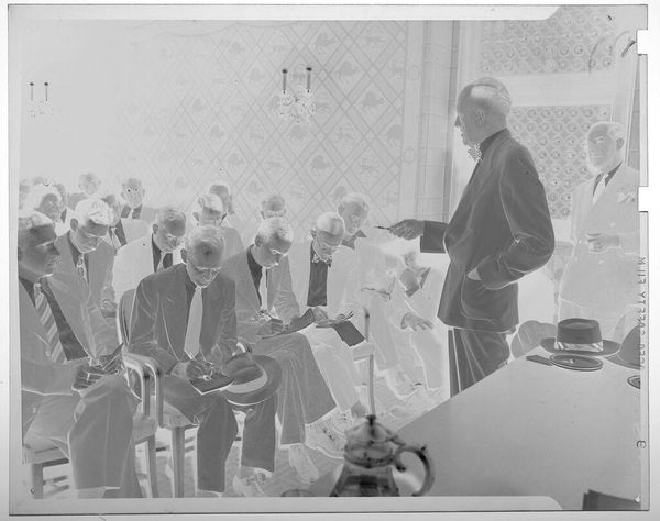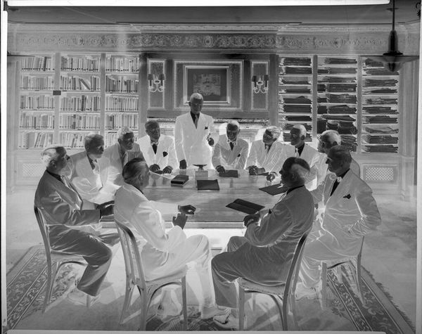 Curator: This photoprint, of indeterminate date, by Lucian and Mary Brown, shows a group of men gathered around a desk. I am struck by the tonal range and how it shapes the narrative. Editor: Immediately, I feel a palpable sense of institutional power. The severe lighting and the inward gaze of the men create a mood that is both contemplative and excluding. Curator: The composition is quite fascinating, the desk serving as a focal point around which the figures are arranged, creating both unity and a sense of hierarchy. Editor: And who gets to be at the table, literally and figuratively? This visual arrangement reflects historical power dynamics; who is allowed in the room and who is not? Curator: Indeed, and through their expert manipulation of light and shadow, the Browns have created a compelling study of form and content, don't you think? Editor: It certainly compels us to look closer at the structures of authority that are often obscured. An important visual document.
