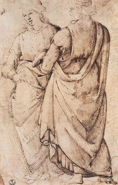 Editor: So, here we have Leonardo da Vinci’s "Study of Hands," a drawing from 1474 rendered in pencil on paper. What strikes me is the incredible detail and care given to representing these hands; they almost seem to possess a life of their own. What can you tell me about it? Curator: This drawing invites us to consider the broader role of hands within the socio-political landscape of the Renaissance. Hands weren't merely functional; they were deeply symbolic, tied to notions of labour, status, and even religious devotion. How does this relate to the people of the time and place in which it was produced? Editor: That's interesting! I hadn't thought about how much social meaning could be embedded in a drawing of hands. I guess I just saw them as... hands. So how would this have affected viewers in Da Vinci's time? Curator: Consider the religious connotations: hands in prayer, in blessing, in labour considered sacred. The depiction of hands here can allude to the immense physical efforts and societal transformations of the Italian Renaissance. Da Vinci wasn't simply capturing anatomy; he was capturing humanity’s relationship with the divine through manual effort, both creative and practical. What do you notice about the gesture of each hand and the relationship they have with one another? Editor: Now that you point it out, it's amazing to see how the subtle differences in the poses of these hands—one open, receptive, and the other closed and grasping, maybe—evoke such distinct emotions. It shows me a completely different side of Renaissance art! Curator: Absolutely. Seeing beyond the aesthetic surface reveals the power dynamics and cultural narratives embedded in the art of the Renaissance. Every curve and line reflects the socio-cultural fingerprint of its time. Editor: This has completely shifted my understanding. I now appreciate the role of social and cultural context, thanks to you, and have a different perspective about these hands that tell such a moving story about labor and religious devotion during that time.