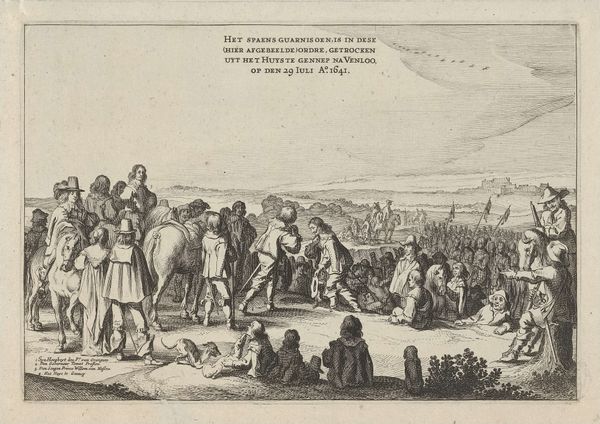 This etching by Pieter Nolpe, made around 1641, captures the departure of the Spanish garrison from Gennep. The composition is structured around a receding perspective that guides the eye from the foreground figures towards the distant horizon. The stark contrast between the detailed rendering of the foreground and the more schematic treatment of the background creates a visual hierarchy. Linear precision defines the characters’ garments in the foreground, as they stand as witnesses, in contrast to the scattered groups of soldiers in the background. The etching’s formal qualities—the strategic use of line, the manipulation of scale, and the stark contrast between foreground and background, not only depict a historical event but also invite us to consider themes of power and spectatorship. Nolpe uses formal construction to create a narrative that goes beyond mere documentation.