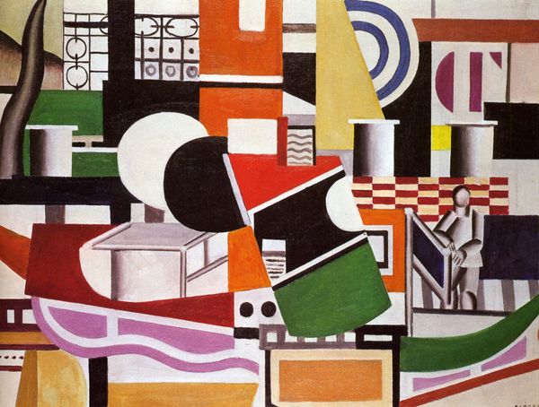 Curator: Fernand Léger’s “Les Maisons,” painted in 1922. A stunning example of his cubist-inspired style, rendered in oil on canvas. What are your immediate impressions? Editor: It's almost like a blueprint exploded, then was painstakingly reconstructed with bold, flat color blocks. The hard edges give it an intense, industrial feel. It suggests both order and disruption simultaneously. Curator: Exactly! Léger, deeply affected by his experiences during World War I and the rise of industrial production, was fascinated by machines and the modern city. This painting embodies his vision. Look closely; how do the geometric shapes evoke actual architecture, the "houses" of the title? Editor: Well, those stark black rectangles seem to mimic windows, don't they? The varying depths and juxtapositions challenge conventional perspective, giving a fractured sense of space... it resists easy interpretation, as though reflecting the disorientation of post-war society. How might its themes reflect Léger's particular time and place? Curator: I would say profoundly. Léger intentionally reduces buildings to their fundamental forms: cylinders, cubes, and spheres. This is, in part, his tribute to the working class who built these environments. The unmodulated blocks of color feel like mass-produced elements, underscoring the impact of mechanization and celebrating materials over representation. The making of this art celebrates industry itself. Editor: Absolutely, the color palette is particularly intriguing. We have this limited range dominated by primaries like the strong reds and blues mixed with neutral shades. The buildings are essentially reduced to essential elements as you stated. And given when this was created, it reads to me almost like a social commentary; a nod to a kind of reconstruction effort with these sharp angles suggestive of tension inherent in rebuilding both physically and psychologically from traumatic, shared experiences. Curator: Yes, these components embody the resilience and pragmatism required during the interwar era when resources were repurposed toward new possibilities and new artistic creations. What stays with you after encountering Léger's cityscape? Editor: The tension between optimism and anxiety. A dynamic composition built from the simple units celebrates modern life. However, I read a dehumanized anonymity through that simplification. Curator: I agree that the dialogue he fostered between labor, material, and machine challenges viewers to contemplate our own places within rapidly changing, urban landscapes.