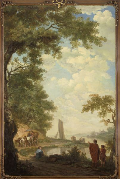 Curator: Here we have "Italian Landscape with three Women in the foreground," one of a series of paintings Gerard de Lairesse completed around 1687 as a room decoration for Jacob de Flines' house in Amsterdam. Editor: It feels very stagey, doesn’t it? Like a backdrop for an opera. Grand, slightly artificial. The colors are almost faded, but in a beautiful way. Curator: Indeed. The entire composition is deliberately constructed using strong horizontal and vertical lines to create a sense of balance. Look how the women are placed relative to the architecture and the pillar. The foreground draws your eye, while the figures fade softly into the background. Editor: I’m fascinated by that pyramid-shaped roof. Is that supposed to be exotic, or is it just...eccentric? It contrasts so strangely with the almost classical statue on the pillar. A nice dose of whimsy against that formality. Curator: Lairesse was drawing on established conventions. He blends historical and genre painting conventions, elevating a domestic interior with classical themes and idealized forms. The women's clothing and poses evoke figures from mythology or historical narratives, contributing to the painting’s intended status and cultured environment. Editor: Those women look bored. Seriously! I imagine they're longing for their Netflix and chill time instead of posing in this meticulously arranged scene. What do you reckon their story would be if they could write it? Curator: That is precisely the challenge: their interior lives remain deliberately obscured behind these painterly artifices, allowing them to signify the virtues and refinement prized at the time. But their gestures – they provide access to subtle meanings. See the offered fruit, an emblem of charity. Editor: Even though it feels incredibly posed and somewhat static, it holds this serene quality. You could happily stare at it. There's beauty in the almost monochrome tonality, creating unity within that architectural construct and theatrical atmosphere. I may prefer that hypothetical sitcom of theirs, though! Curator: Absolutely. It exemplifies how a space could embody its patrons’ aspirations for knowledge and elevated status at the time. Editor: It certainly does, I feel as though I'm standing on the stage, or rather inside of it and witnessing all this play out myself!