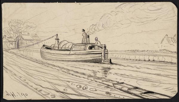 Editor: This is "City of Sacramento," a woodcut print by Fay Chong. I find the high contrast really striking and creates this almost stark feeling. What should we be paying attention to in this piece? Curator: The directness of woodcut suits Chong's socially engaged art. Woodcuts are historically linked with populist movements, accessible as a medium for mass dissemination of ideas. Think about its relationship to labor: how does this stark rendering reflect the artist's experience or commentary on work and industrialization during the period when Sacramento modernized? Editor: That's fascinating, I didn’t consider that at all. Does that relationship with labor impact how he depicts the boat or even the city behind it? Curator: Absolutely. Consider the strong diagonals and bold lines of the ship. Where are we positioned in relation to it? And how does Chong's choice to use such a graphic, almost architectural style to render these elements contribute to a narrative of progress, or perhaps of the impact of such development? Are there figures present? Editor: I see two people walking. So the print isn’t totally absent of humanity but… it is dwarfed by the machines. I am gathering that the woodcut's bold style makes you see a lot of those sociopolitical questions around labor? Curator: Exactly. Chong prompts us to critically examine not just the visual representation but the cultural and socio-economic forces that shape our understanding of “progress”. So, what do we take away when considering both the medium and the subject? Editor: I'm now viewing it less as just a historical image and more as a statement about the changing landscape of cities, even now. It’s incredible how much history can be embedded in a print!