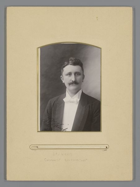 Editor: This albumen print, taken between 1875 and 1888 by Clovis Claret, presents a rather dignified gentleman with a magnificent mustache. The sepia tones and oval composition give it an antiquated feel. What strikes you when you look at this portrait? Curator: The albumen print process itself is key. Notice how the fine details, the texture of his hair and clothing, are rendered. Claret clearly had a mastery of light and shadow, creating depth within the restrictive format. Editor: The framing does feel quite formal, almost staged. Curator: Indeed. The tight oval format directs the viewer’s eye entirely towards the subject’s face. The neutral backdrop flattens the space, emphasizing the man’s features. Note, also, the precision of the bowtie—it is in high contrast against the starkness of the man's shirt, making it all the more apparent. What does that focal choice do, do you think? Editor: It might suggest attention to detail, a certain meticulousness? Or just that the clothes matter. Curator: Precisely. The subject’s posture and expression are carefully controlled. The slightly averted gaze hints at introspection, but ultimately, the composition is concerned with projecting an image of respectability. Editor: It's interesting how the constraints of the medium and the deliberate composition work together to create a particular effect. I wouldn't have thought so much intention went into it! Curator: Studying the formal elements allows us to understand how images, even seemingly simple portraits, convey complex ideas.