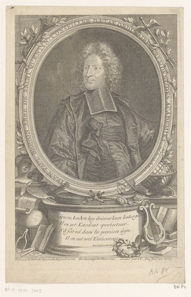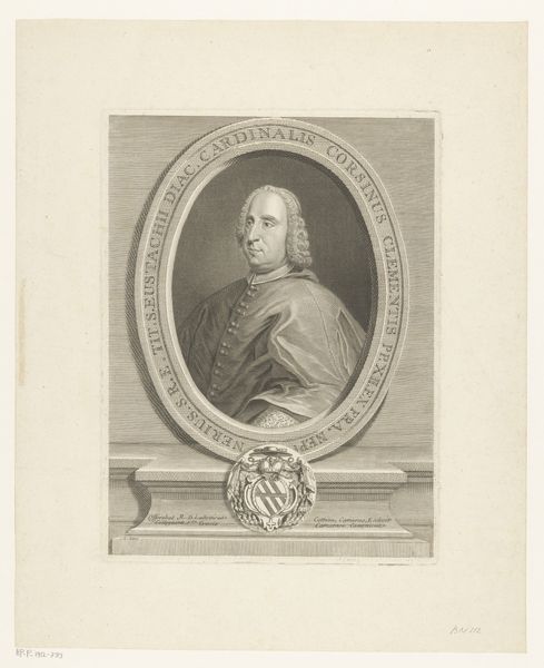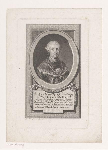 This is Gottlieb Leberecht Crusius's portrait of Antonio Fracassini, made with etching. Fracassini, a physician, is framed in a style that reflects the 18th-century Enlightenment era. The image embodies the period’s emphasis on reason, science, and the celebration of intellectual figures. As a portrait of a man of science, Fracassini is presented with an air of authority and intellect, reflecting the social status and power associated with his profession during this period. The way he is styled, down to his powdered wig, is part of a performance of masculinity intertwined with class and professional identity. The portrait exists within a culture deeply stratified by class, and while Crusius portrays Fracassini with reverence, we might ask ourselves how this image participates in a broader narrative of power and representation. The image may invite reflection on the individuals and communities that were then excluded from such portrayals.