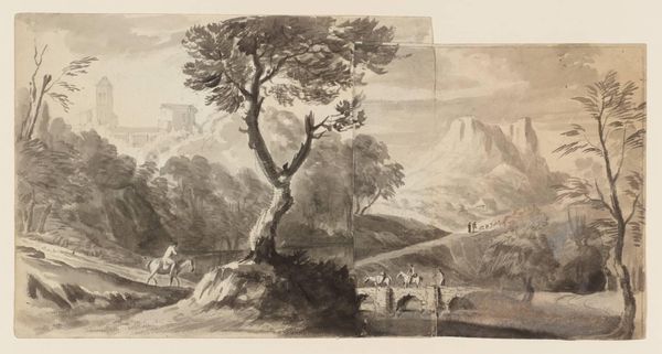 Editor: This is "The Rhône" by Alexander Cozens. It's a sepia drawing. It feels like a memory. What do you see in it? Curator: I see the dominance of the sepia wash, a cheap and easily accessible material. Its widespread use speaks to a shift in art production, making landscape sketches more accessible to a wider audience. How does this democratization of art influence your perception of its value? Editor: I hadn't considered the economic aspect. It changes my understanding of Cozens's intent. Thank you. Curator: Indeed, considering the material conditions challenges conventional notions of artistic genius and elevates the role of production.