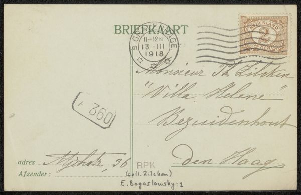 Curator: Here we have a postcard, believed to be from 1914. It's titled "Briefkaart aan Philip Zilcken," likely sent to that very individual. Editor: It looks… delicate. The handwritten script makes me think of fragile memories, like catching whispers from the past. You can almost smell the old paper. Curator: Indeed. Fenna de Meyier, the artist, utilized ink and pen to create this piece, and one notices that postal markings and script are essential, interwoven parts of the overall design. The handwriting style tells us so much about the social milieu in which it was created. Editor: It is lovely! It feels almost rebellious. Look at how casual it all is – the blurring of art and correspondence. One might ask themselves: is this simply someone scribbling to a friend, or making a deeply private piece available for viewing? I adore how the mundane nature of a written note challenges stuffy, artistic borders. Curator: Exactly. The choice of a common postal material is quite pointed, in fact. These small acts become incredibly interesting when you consider them within early 20th-century material culture, the rise of the postal system as a site of national and social exchange. It is not accidental that something so ephemeral was sent. Editor: You know, seeing this makes me feel a yearning for simpler times. And perhaps, it prompts an awareness of all the human interactions and physical material culture our fast-paced digital realm often sweeps aside in a mad rush toward immateriality. Curator: A very astute observation. The history, manufacture, distribution, even the postal rates encoded within this single artifact reveals such depth of material and economic engagement, just below a deceivingly calm and conventional exterior. Editor: Beautiful! The emotional imprint, the time-worn traces left, add so much beyond any surface aesthetic. Curator: A testament to the idea that even an everyday item carries substantial cultural meaning, offering us a window into both art history and lived social practice.