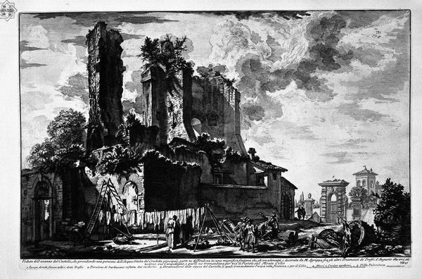 Curator: Look at the drama captured in this etching, "View of Campo Vaccino" by Giovanni Battista Piranesi. Editor: It’s incredibly detailed! There's something bleak about the subject matter: all these classical ruins, crumbling. You feel a real sense of decay, don't you? Curator: Precisely. Piranesi, of course, was fascinated with the grandeur of Rome, both present and past. But in this etching, note the meticulous process: the artist’s hand rendering every stone, every shadow, speaks to an obsession with recording, almost cataloging, these monumental remnants of a lost empire. Consider how that act of replication grants these objects an extended material life, shifting the viewers interaction to its making. Editor: Absolutely. This image gains power by emphasizing how empires rise and fall, don’t they? Campo Vaccino—"cattle field"—is essentially what the Roman Forum became. The name change signals its abandonment by elites. It’s almost like he's subtly criticizing the state of eighteenth-century Rome, maybe reminding them of what they’re failing to uphold, through contrasting it with these glorious ruins, once symbols of such a mighty power. Curator: He does play with perspective and scale. Piranesi was a master printmaker. How do the repetitive etching marks add to the understanding of the labor involved in representing this site? Note, for instance, the figures he includes in the print itself; are they, too, like us as contemporary museum-goers consuming remnants? Editor: Good question. His cityscapes aren’t just beautiful; they also create narratives around architecture, right? They certainly fueled the imagination of many a Grand Tourist! Curator: They did, and in doing so, they became commodities, traded on the artistic marketplace and contributing to eighteenth-century Italian consumption trends. Editor: So the artistic value becomes almost secondary to its socio-political effect: the spread of Roman cultural prestige. Fascinating. I didn’t think I could learn that much from a cattle field. Curator: Nor I! What an insight into cultural transmission in its own right.