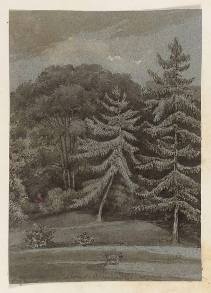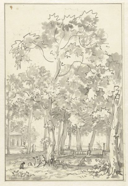 Jurriaan Andriessen created this design for a wallpaper painting with watercolor and graphite, now held at the Rijksmuseum. At first glance, the composition, dominated by muted greens and blues, evokes a sense of serene Dutch countryside. The structure of the design is divided into three horizontal bands, each suggesting a different spatial plane. The sky, rendered with soft washes, transitions into a middle ground where trees and a quaint building nestle. The foreground features water and foliage, creating depth through layering. Andriessen employs line work to define the shapes of the trees and building, but the washes of color soften these contours, integrating them into the landscape. This technique reflects the 18th-century interest in the picturesque and the sublime, where art sought to capture the emotional impact of nature. The wallpaper design, intended for an interior space, brought the outside in, allowing viewers to contemplate the tranquil ideals of nature within the structure of their homes. The subtle gradations of tone and color, carefully structured, contribute to a calming visual experience.