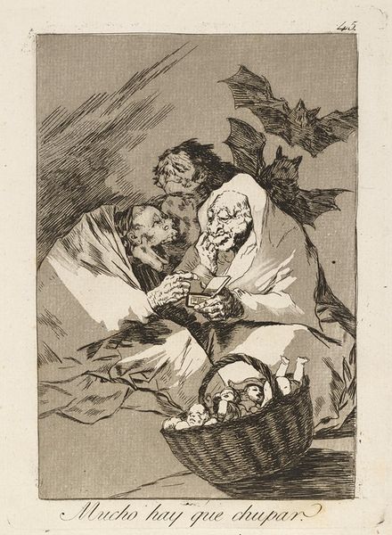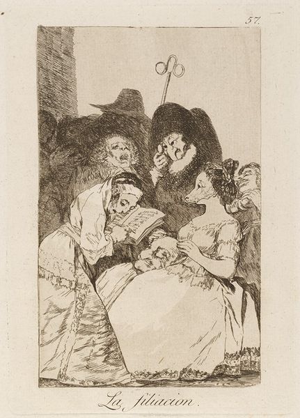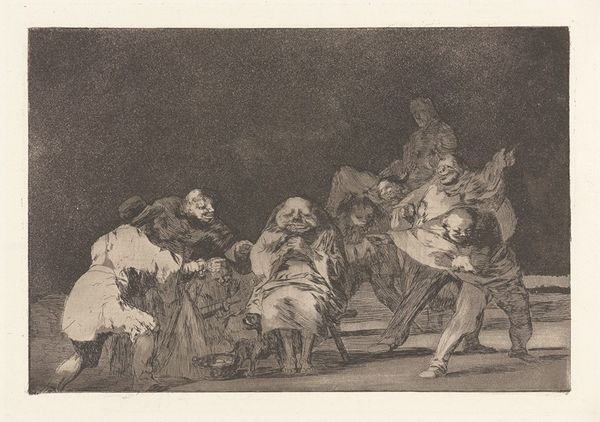 Editor: So, this is "Esto si que es leer." or "This is really knowing how to read," by Francisco Goya, made around 1796-97. It's an etching and aquatint print. There’s definitely something unsettling about the expressions in this print; they almost feel like they are mocking the central figure. How do you interpret this work? Curator: This image, part of Goya’s *Los Caprichos*, transcends mere caricature. The seeming assault on this old man by grotesque figures becomes a powerful commentary on enlightenment ideals under siege. Consider the socio-political climate: The French Revolution had just ended and traditional hierarchies felt threatened. Editor: I see what you mean! The old man’s exaggerated features alongside these shadowy figures... Curator: Exactly. Could Goya be suggesting that reason, represented by the engrossed reader, is being besieged by ignorance and malice? Notice how the shadows seem to represent social unrest. Goya was a court painter but through his prints, he critiqued society’s ills: superstition, ignorance and abuse of power. Editor: That’s a potent reading, especially considering the title's irony. It’s not about reading for knowledge but rather about the struggle for knowledge in a hostile world. Curator: Precisely. Think of it as a microcosm of societal tensions where intellectualism, personified by this aging scholar, is under constant threat. The *Los Caprichos* series reflects this fear of society turning back to darker ways of thinking. This piece becomes an intersectional lens that reveals power dynamics in late 18th-century Spain. Editor: I hadn't considered it in that light. I was focused on the individuals and the immediate expressions, but contextualizing it within that period of revolution and upheaval makes so much more sense. Thanks for this perspective! Curator: Absolutely! Viewing artwork as embedded within historical and political realities is crucial for truly understanding its power.