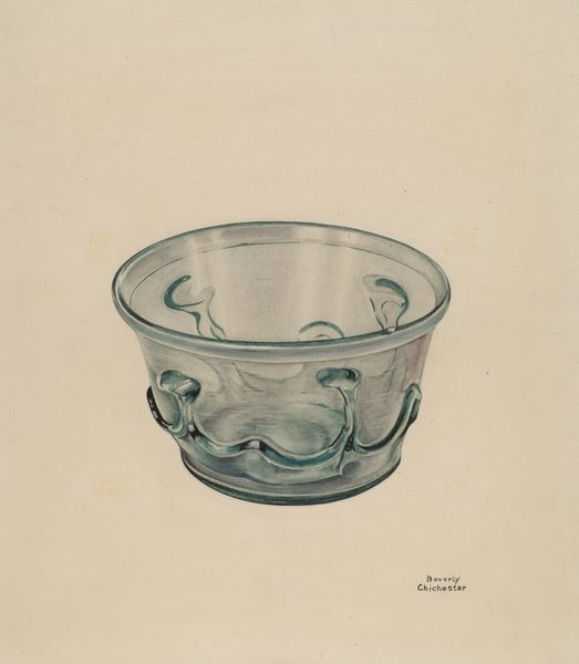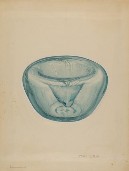 Curator: Here we have Michael J. Miceli’s "Glass Milk Pan," a watercolor drawing from around 1937. What catches your eye about it? Editor: Well, immediately I see this ethereal, almost dreamlike quality, considering it is just a humble milk pan. The subtle washes of blue suggest the coolness and fragility of glass. Curator: Yes, Miceli’s choice of watercolor beautifully captures the translucence and delicate nature of the material. You know, during this time, there was a real emphasis on representing everyday objects in art, elevating them to subjects worthy of contemplation. Editor: It really asks us to look closer. Focusing on an object from the domestic sphere like this suggests the impact of mass production in American homes. Was this type of glassware common then? It has that almost utilitarian quality to it. Curator: Indeed, though simple, its form speaks to functionality but there is care to its rendering here, beyond pure function, don’t you think? Watercolor was also seen as sort of, well, “less serious” than oil at this time. Editor: Interesting... It’s like celebrating the ordinary through an embrace of everyday materials. Thinking about the role of craft here...the intimacy involved in depiction and utility challenges traditional hierarchy. It's not just about the end result but the making, the labor of representing domesticity itself. Curator: Exactly! There’s almost a stillness to it that invites us to pause. It reminds me of a haiku, finding beauty in simplicity. Editor: Perhaps it's a challenge to our consumer culture...a celebration of the hand. And maybe it asks a larger question of what we value? Curator: Precisely. It seems to make even the simplest object worthy of being closely observed and immortalized on paper. It is as if he has opened our eyes to the significance found in these forgotten corners. Editor: Makes you think of the journey, not the destination. Curator: Indeed, thanks for sharing that insight! I hadn’t thought of it in quite that way before.