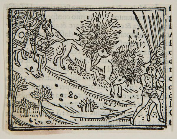 Curator: This anonymous print, titled "Book XXI.28-29. Hannibal plans to convey elephants across the river," presents a fascinating glimpse into historical imagination. Editor: My first impression is how stark and graphic it is—the linear patterns create such a tense, active scene. The diagonal lines across the water really do give the impression of movement. Curator: Indeed. And see how the artist uses the woodcut medium—the stark contrast between the black lines and white space creates a dramatic, almost theatrical effect. Notice how the figures are arranged almost like a frieze, directing our gaze across the composition. Editor: Absolutely, and within that arrangement, consider the elephant. It's not just an animal, but a symbol of power and exoticism, representing the audacity of Hannibal's military campaign. Curator: Precisely, and the bridge itself—a precarious link—becomes symbolic of the ambitious and risky nature of Hannibal’s endeavor. Editor: Looking at the print's formal qualities, one can truly grasp its symbolic depth. Curator: Yes, a simple scene visually, but laden with historical weight. Editor: It's remarkable how this print encapsulates such grand historical narratives.