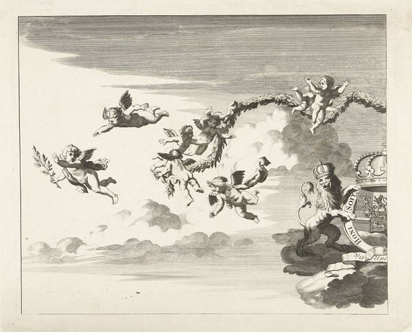 This "Plafondontwerp met putti," or ceiling design with cherubs, was made by Bernhard Schreuder in the 18th century, using pen and brown ink, brush, and gray wash on paper. The appeal of this design lies in its masterful use of wash, a technique that involves diluting ink to create subtle tonal gradations. See how Schreuder uses the wash to create depth and volume, defining the forms of the putti and clouds. The controlled application of washes highlights the artist’s mastery of his materials, turning a simple sketch into a persuasive suggestion of the final ceiling’s appearance. This method, which was not only aesthetically pleasing but also cost-effective, allowed artists to pitch grand artistic visions to wealthy patrons. The careful labor involved in creating this design, with its complex arrangement of figures, underscores the importance of craftsmanship in the production of art and architecture during the 18th century. The sketch is not only a piece of art in itself, but also a reflection of the economic and social structures that supported artistic creation. By appreciating the materials, the making, and the context, we gain a fuller understanding of the artwork.
