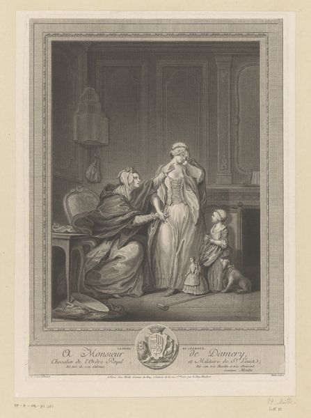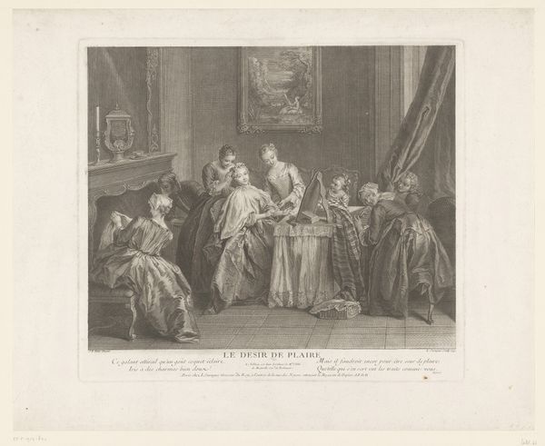 Curator: This engraving, “Huwelijksovereenkomst” or "Marriage Agreement" by René Gaillard, dated before 1754, depicts a fascinating social tableau. What are your first thoughts? Editor: Well, the scene is so meticulously rendered, capturing this formal exchange between what I presume are the bride and groom. It feels like such a staged event; everyone is on display. It almost feels like theater. How do you interpret this staging of marriage? Curator: Exactly! The composition reminds us that marriage, especially amongst the elite during this period, was a public performance deeply intertwined with social and political structures. Consider the artist's choice to represent this moment in such detail. Why foreground this transaction so explicitly? Editor: Maybe it's highlighting the contract itself, making visible what was essentially an economic and social agreement? The couple seem almost secondary to the legal document about to be signed. Curator: Precisely. Engravings like this circulated widely, serving as both records and pronouncements of power dynamics. It presented not just an event, but a public lesson in the correct order of society, where lineage, property, and duty took center stage. Do you notice how the inclusion of seemingly small elements such as clothing contribute to these classist implications? Editor: Absolutely! The extravagant clothing shows immense privilege; the serious wigs and stern faces all underline the wealth and social position being cemented. I guess I had underestimated how much the image promoted the ideology of the time. Curator: Exactly. We can better appreciate this engraving if we consider it an active player in shaping public perception of marriage and the power structures within 18th century society. Editor: I now see how viewing it through that historical and cultural context provides a richer and more complex understanding than a first glance. Thanks!