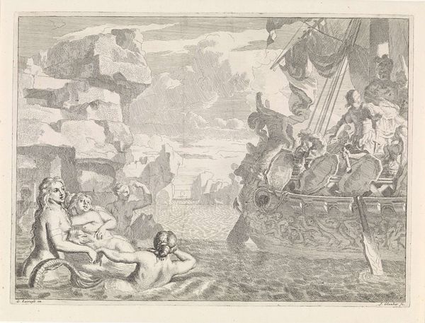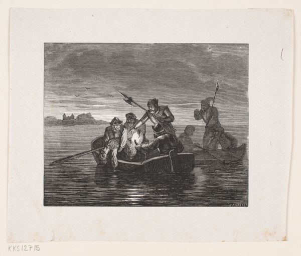 Curator: This engraving, attributed to Isaac Weissenbruch and dated roughly between 1836 and 1912, depicts a group of men on a boat hoisting a flag. Editor: My immediate impression is one of clandestine activity. The stark lines and restricted palette give it a secretive, almost rebellious mood. The figures are densely packed, suggesting urgency and collective action. Curator: Indeed. The text emblazoned on the flag, "De Sabbathbreekster," which translates to "The Sabbath Breaker," adds another layer of intrigue. This connects to a specific socio-religious context. Consider the meaning ascribed to the Sabbath, rest and worship. What does it mean to publicly break it, and who would celebrate that act? Editor: Precisely! Flags are fascinating symbols, and this one broadcasts a clear, albeit subversive, message. Visually, the flag becomes a symbol of resistance or defiance against religious law. The figures, by hoisting it, embody a shared identity rooted in this defiance. Who exactly they are, though, remains unclear. Curator: That's where material context becomes key. Given Weissenbruch's focus on the daily life of ordinary people, the print suggests a communal event, perhaps related to labor practices or political protest. Think of it as an image about access: access to labor and leisure, maybe even resistance against restrictive religious norms upheld by societal powers. Editor: And the water itself! The medium carrying the 'breakers', fluid and uncontrollable, reflecting both potential and instability. Even the choice to render it in engraving--a medium historically associated with distributing information and creating multiple copies--underscores its potential for widespread influence and perhaps instigation. Curator: Yes, engraving made it an affordable artwork at that time, a potentially radical message circulating for all to see, printed again and again...it shifts the status of the image away from rarefied "high art", embedding it within everyday visual culture and political discourse. It's not just *what* it represents but *how* it became representation itself, manufactured, multiplied, distributed, maybe pasted to walls... Editor: What lingers with me is this rather potent declaration of breaking from convention; it raises enduring questions about authority and collective rebellion. What sacred cows do we collectively challenge, or uphold, today? Curator: For me, understanding the technical process and historical backdrop illuminates the socio-political message. The engraving is not just a picture, but a manufactured object of rebellion, disseminated in its time, and now resonating differently, if subtly, even today.