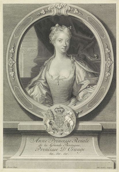 Editor: Here we have a rather stately engraving titled "Portret van Sophia Dorothea van Hannover," made sometime between 1713 and 1740 by Jacob Houbraken. The detail is astonishing for a print, but I confess it strikes me as a little...somber? All that baroque pomp and circumstance! What do you make of it? Curator: Somber, perhaps, but wouldn’t you agree that's part of its charm? It's like stepping back into a world where even portraits were statements of power and dynasty. It whispers secrets of powdered wigs and arranged marriages. Houbraken was a master of capturing likeness and status in equal measure. But look beyond the surface; do you see any vulnerability? Editor: Now that you mention it, her gaze isn't exactly... fierce. There's a hint of melancholy there, isn’t there? Almost like she’s tolerating the trappings of royalty rather than reveling in them. Curator: Precisely! Perhaps Houbraken, intentionally or not, captured something of the person behind the crown. She wasn't just a queen; she was a woman living a life dictated by the expectations of her time. It makes you wonder about the stories behind those formal portraits, doesn’t it? Who were these people *really*? Editor: Absolutely! I came in seeing a typical historical portrait, but now I see a bit of a ghost in the machine – a person caught in the gears of history. Curator: Isn't that what makes art so captivating? It holds up a mirror to the past, but the reflection is always open to interpretation. Next time, I bet you see ten new things, no? Editor: No doubt. Thank you! It is amazing how an image starts to change when we simply ask a new question about it.